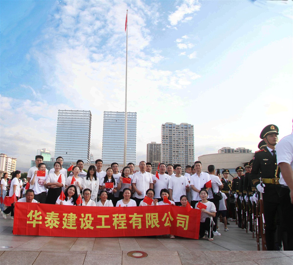 6點(diǎn)10分,在慷慨激昂的《中國人民解放軍進(jìn)行曲》中,英姿颯爽的國旗護(hù)衛(wèi)隊(duì)隊(duì)員踢著堅(jiān)實(shí)而雄健的步伐從候場區(qū)走過金水橋,精神抖擻地護(hù)送國旗走向升旗臺(tái)。隨后,雄壯的中華人民共和國國歌響起,升旗手振臂一揮,鮮艷的五星紅旗冉冉升起。華泰建設(shè)全體員工滿心激動(dòng),仰望國旗、高唱國歌,祝愿偉大祖國繁榮昌盛。