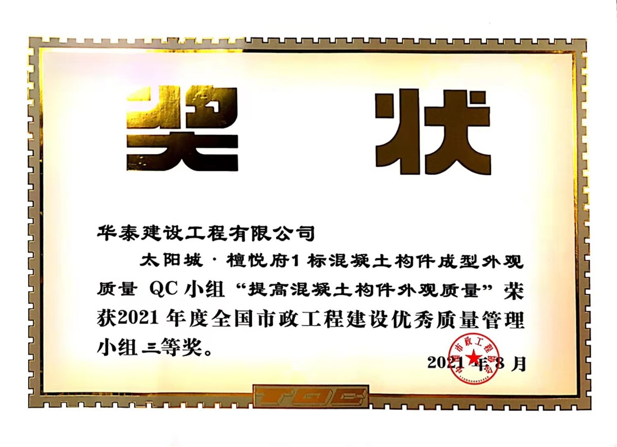 太陽城·檀悅府1標混凝土構件成型外觀質量QC小組“提高混凝土構件外觀質量”榮獲2021年度全國市政工程建設優(yōu)秀質量管理小組三等獎。