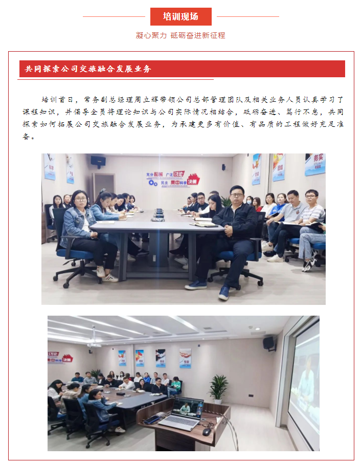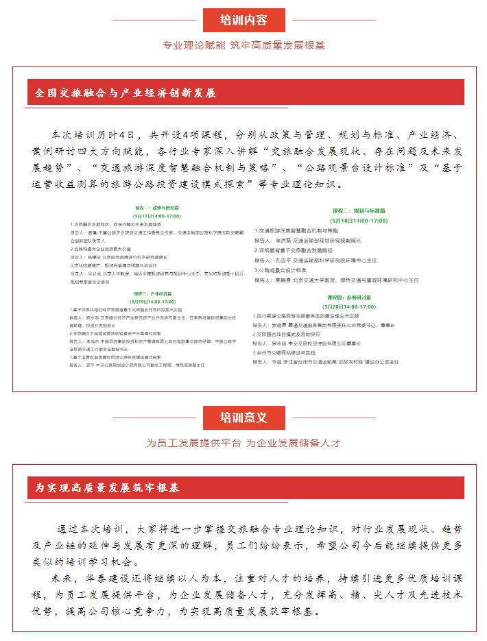 為緊跟當(dāng)下全國建筑行業(yè)業(yè)務(wù)發(fā)展趨勢,為員工普及業(yè)務(wù)理論知識,進(jìn)一步提升公司整體業(yè)務(wù)拓展能力,持續(xù)加強(qiáng)公司梯隊(duì)人才隊(duì)伍建設(shè),華泰建設(shè)于5月17日-20日開展“全國交旅融合與產(chǎn)業(yè)經(jīng)濟(jì)創(chuàng)新發(fā)展”專題業(yè)務(wù)培訓(xùn)。