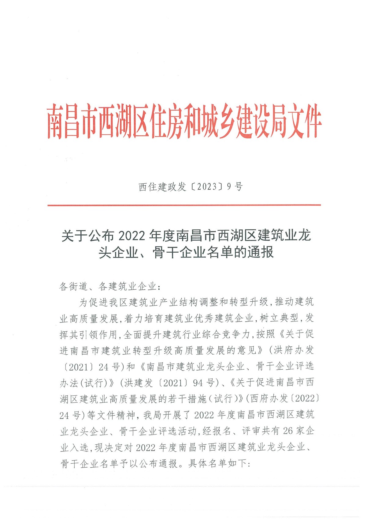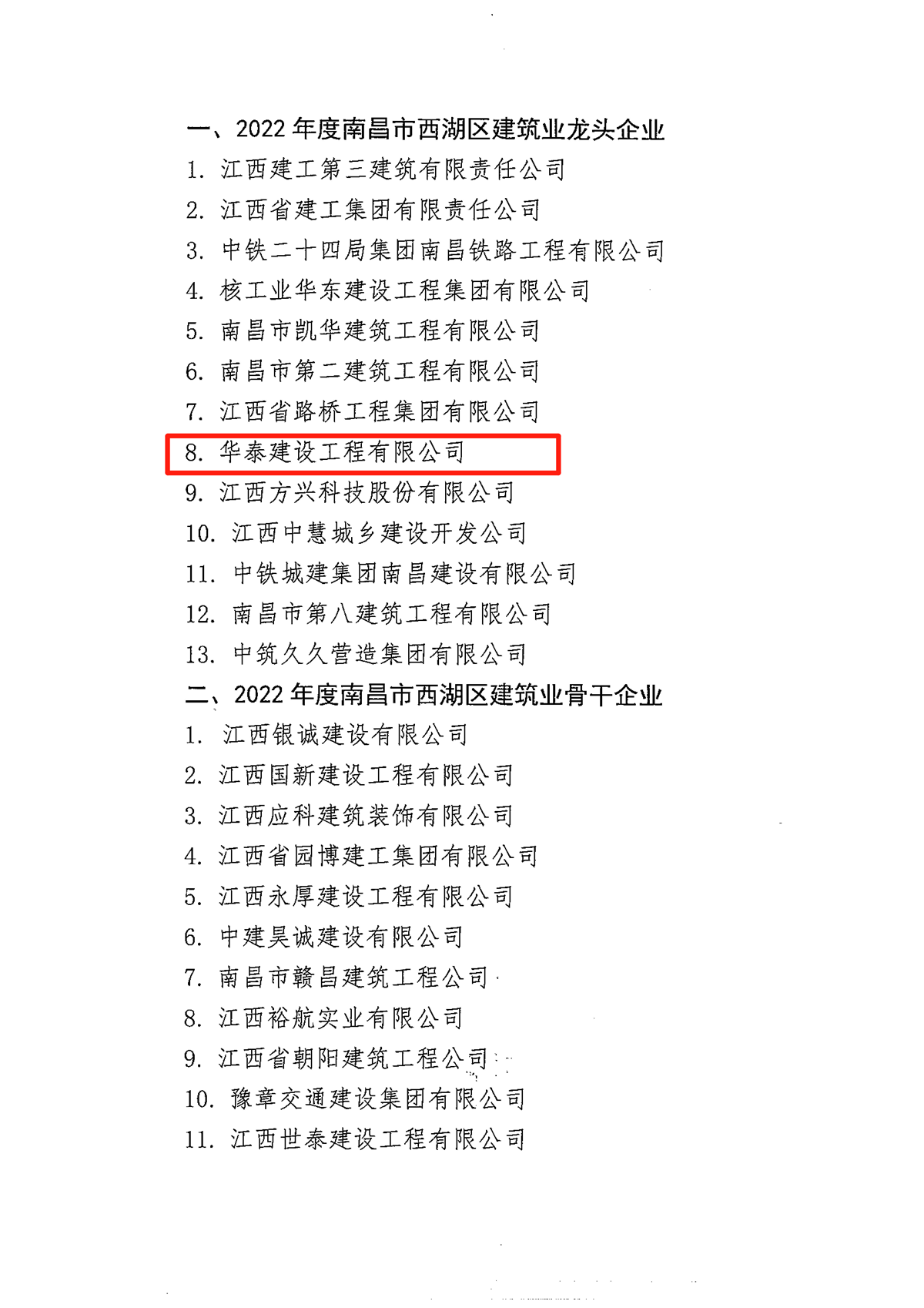 2023年2月21日,恰逢農(nóng)歷二月二龍?zhí)ь^,在這個紅紅火火的日子,南昌市西湖區(qū)住房和城鄉(xiāng)建設(shè)局發(fā)布了《關(guān)于公布2022年度南昌市西湖區(qū)建筑業(yè)龍頭企業(yè)、骨干企業(yè)名單的通報》,經(jīng)層層嚴(yán)格考評認(rèn)定,華泰建設(shè)工程有限公司憑借實干篤行與卓越品質(zhì)獲得“2022年度南昌市西湖區(qū)建筑業(yè)龍頭企業(yè)”榮譽稱號!這是繼2023年1月獲得“2022年度南昌市建筑業(yè)骨干企業(yè)”后的又一個榮譽認(rèn)證。這不僅是對華泰建設(shè)的嘉獎與再次肯定,更是對華泰建設(shè)發(fā)展的激勵與鞭策。