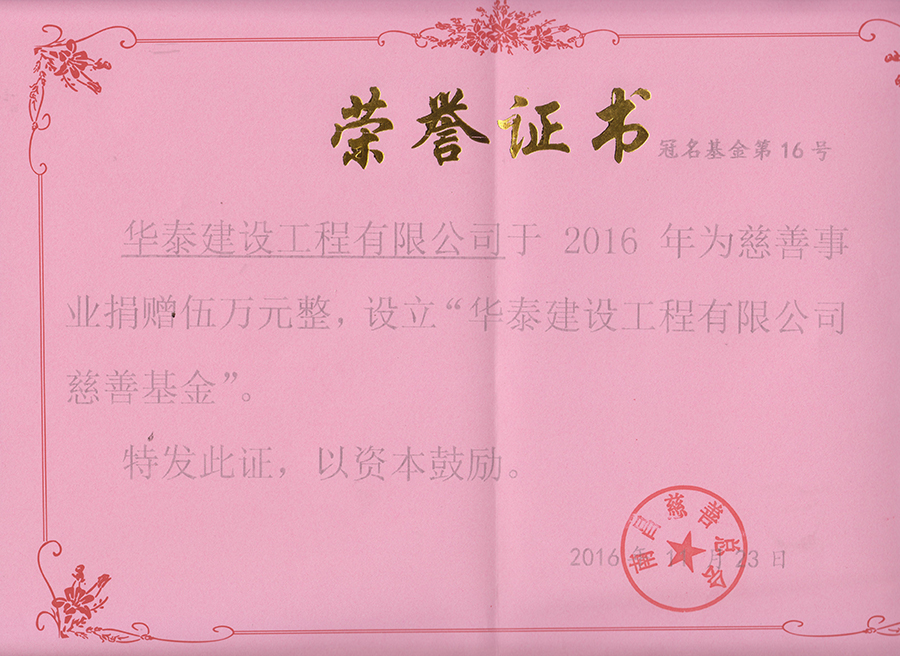 首頁(yè) > 關(guān)于華泰 > 企業(yè)榮譽(yù) > 2016年獲得南昌慈善總會(huì)頒發(fā)榮譽(yù)證書(shū),并設(shè)立慈善基金