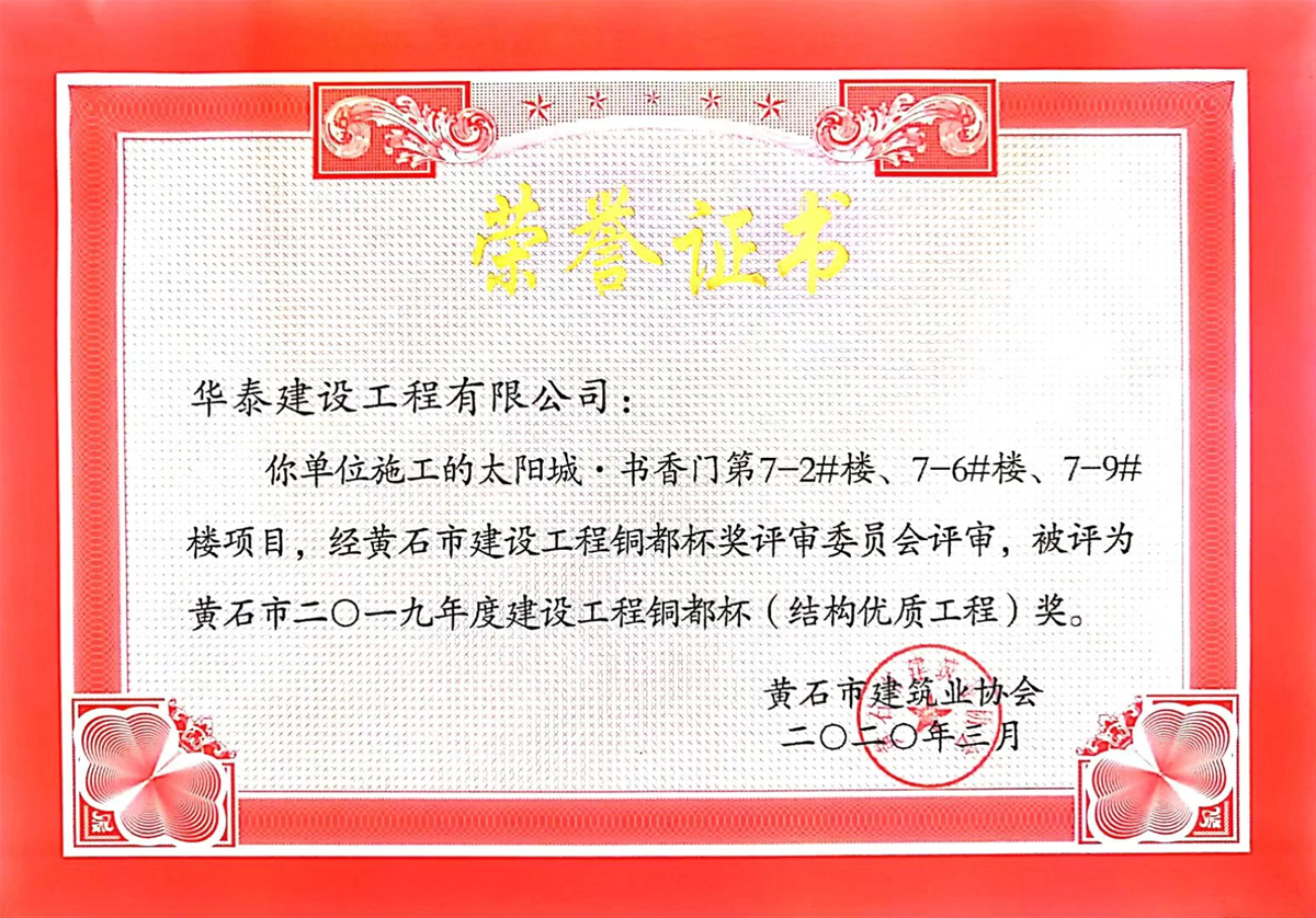 榮獲2019年度黃石市建設(shè)工程結(jié)構(gòu)優(yōu)質(zhì)工程獎(jiǎng) ——太陽城·書香門第