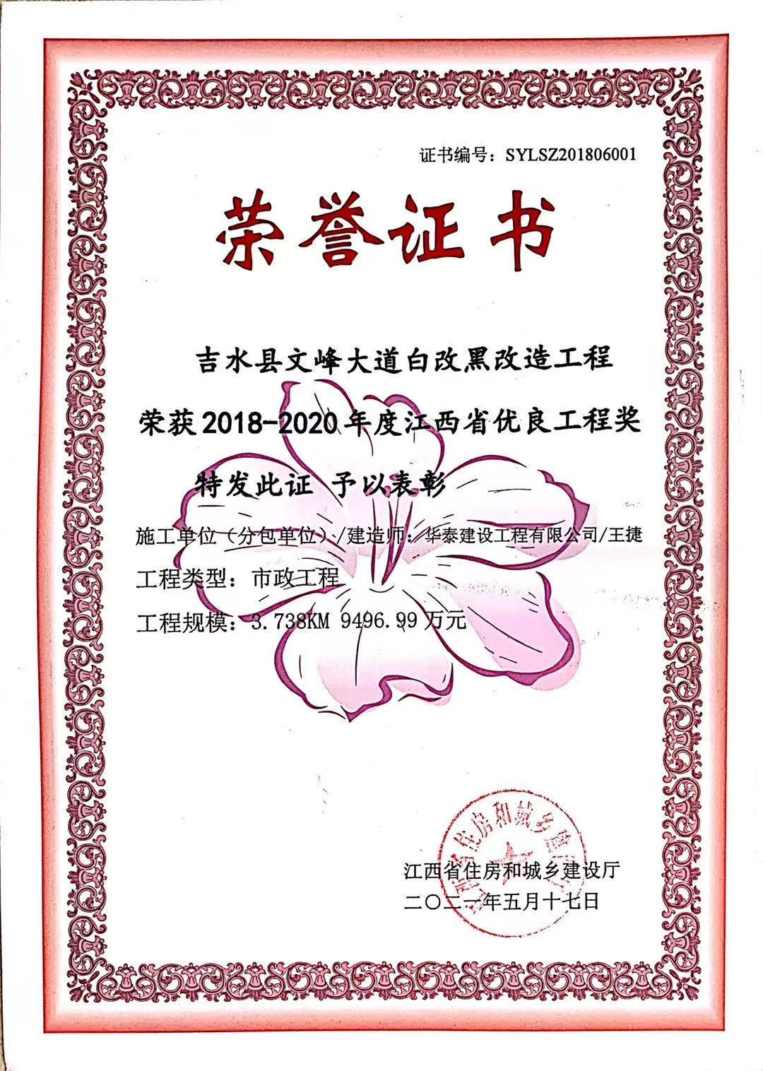榮獲2018-2020年度江西省優(yōu)良工程獎 ——吉水縣文峰大道白改黑改造工程