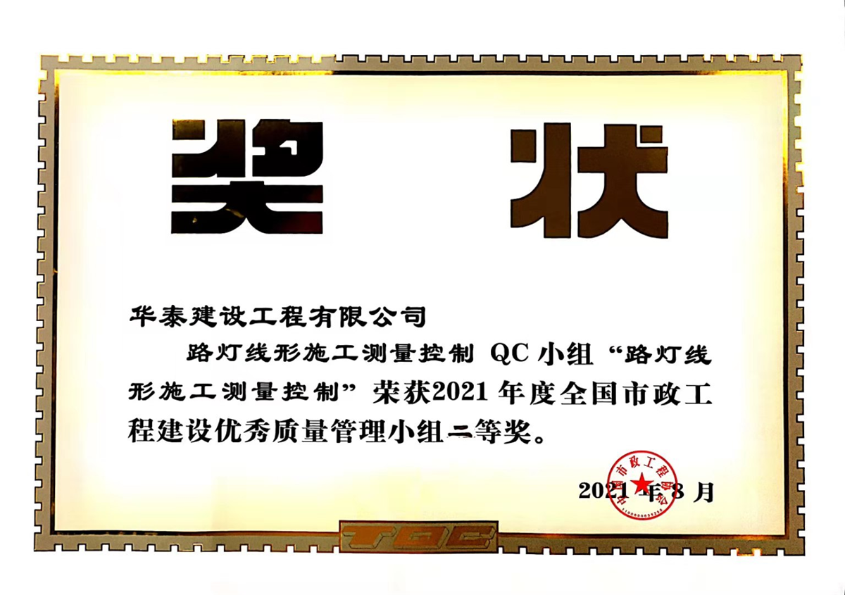 榮獲2021年度全國市政工程建設(shè)優(yōu)秀質(zhì)量管理小組二等獎