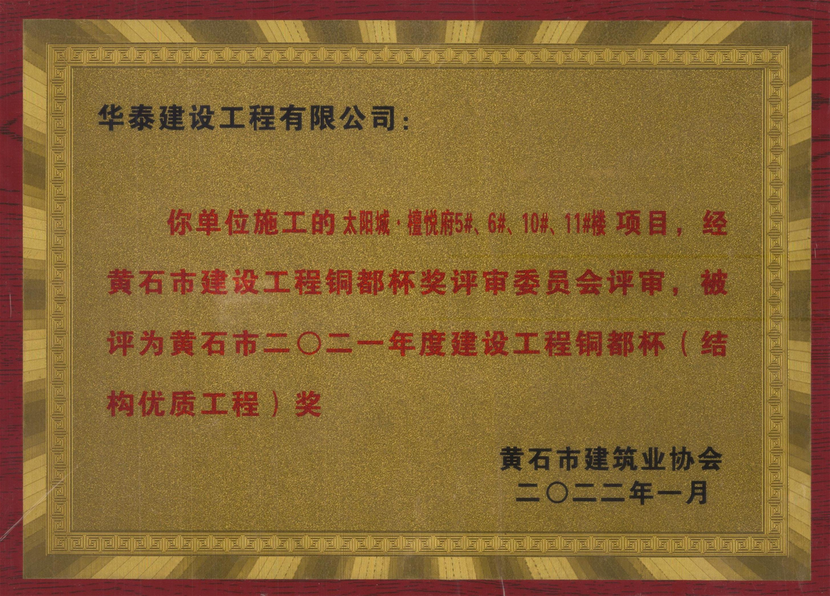 榮獲黃石市2021年度建設工程銅都杯(結(jié)構(gòu)優(yōu)質(zhì)工程)獎